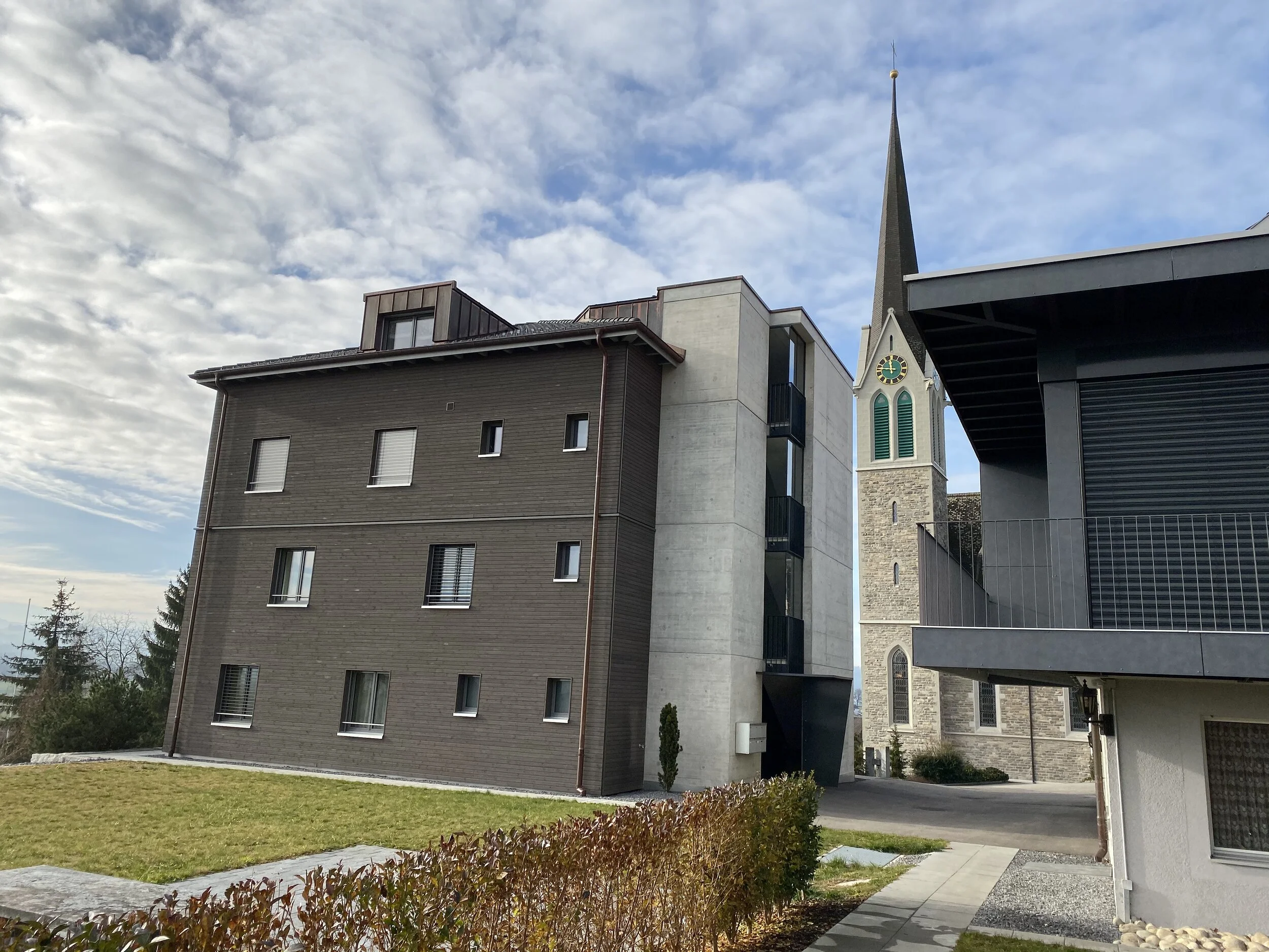 Ersatzneubau für altes Pfarrhaus, Mietwohnungen und Büros für kath. Kirchgemeinde, Massivbau mit hinterlüfteter Holzfassade, Zeltdach mit Ziegeln, Heizung Erdsonden-Wärmepumpe